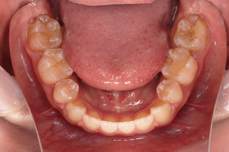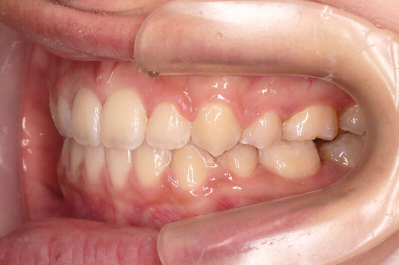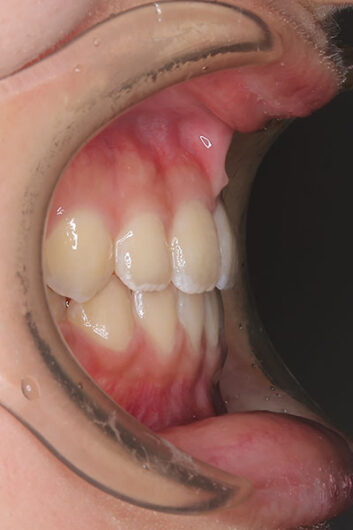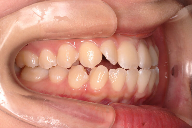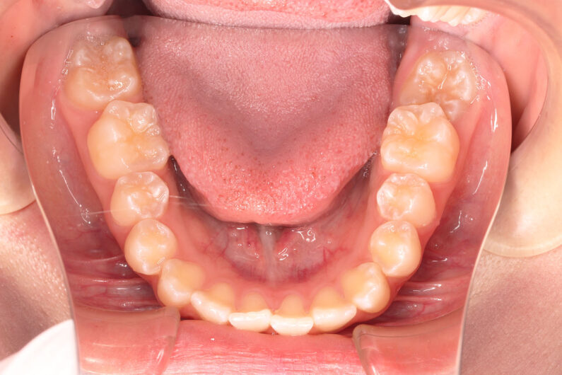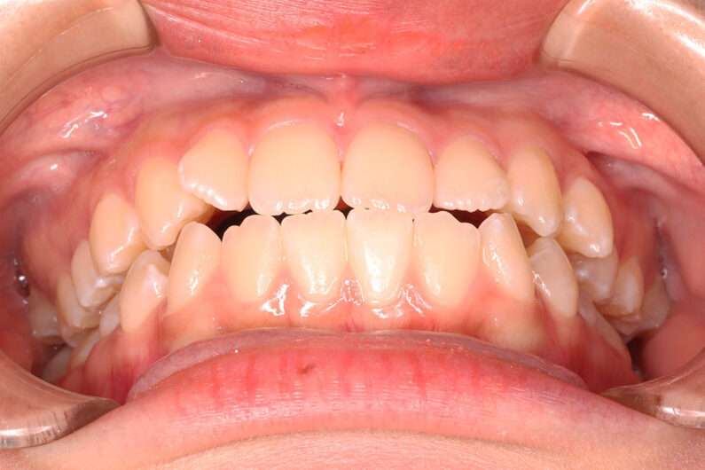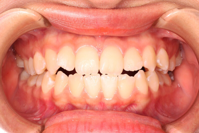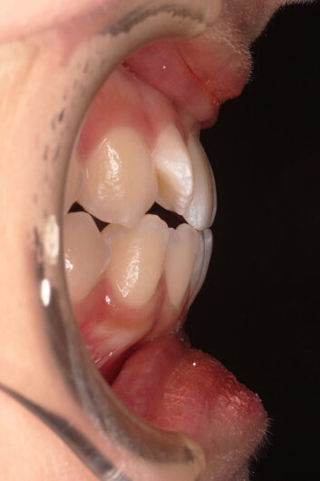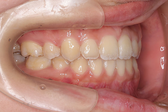 上下の前歯が咬み合っていないことを気にされ、治療を開始した患者さんです。 前歯部は切端咬合で開口です。 それだけではなく、上顎の奥歯が外側(頬側)に飛び出てして下の歯と咬んでいません。 そして下顎左側の奥歯が前の歯に引っかかっていて、生えきれず、埋まった状態になっています。 分析結果から、骨格的には、下顎が上顎より大きい下顎前突症でもありました。 治療は、前歯および奥歯の咬み合わせの改善と下顎左側奥歯(第二大臼歯)の廷出(引っぱり出すこと)を目的として、小臼歯抜歯による治療を行いました。