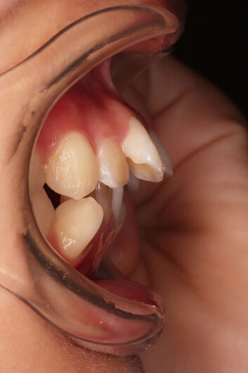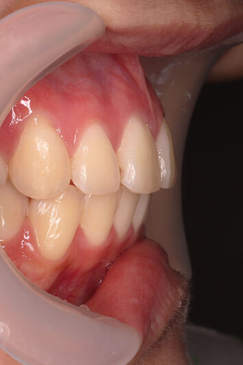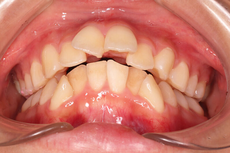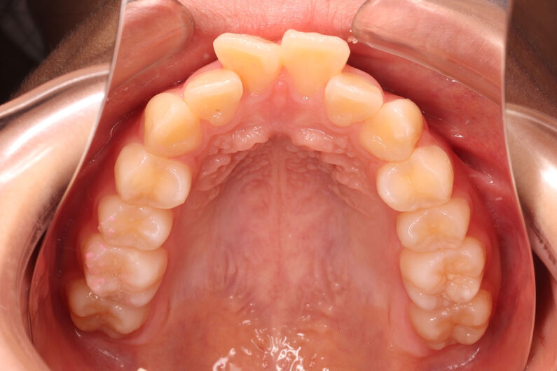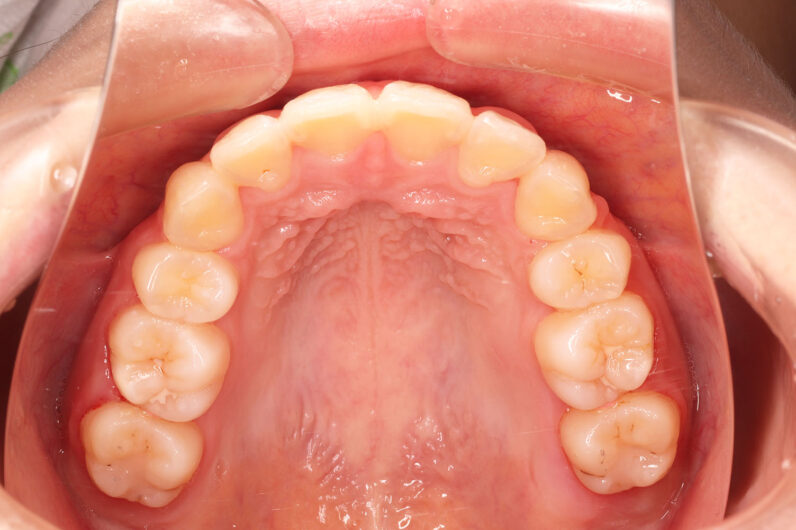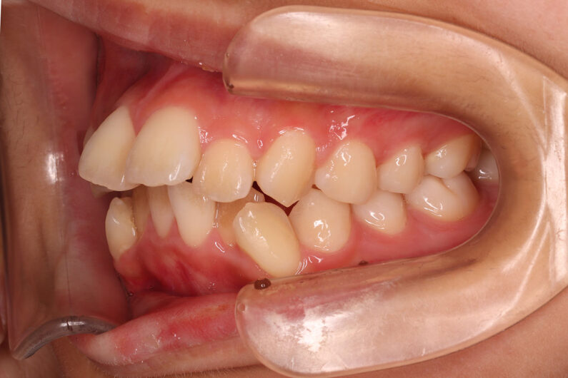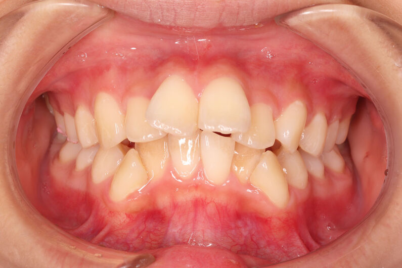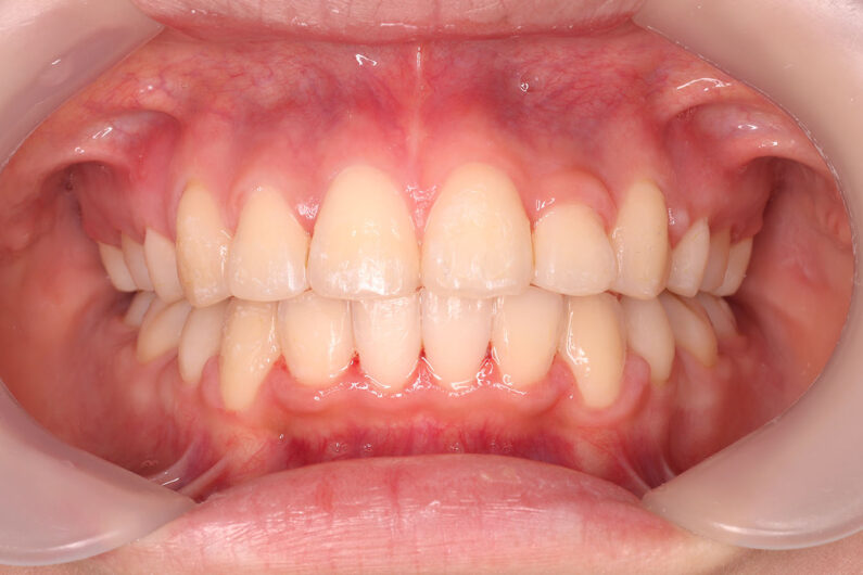 上顎前歯6mm、下顎前歯2.5mmの前突の状態で、口唇も前突しています。 小臼歯抜歯したスペースを使い、叢生(がたつき)と前突した前歯の後退を目標にしました。 この方も希望により、アンカースクリューは使用せず、通常の顎間ゴムで対処してもらいました。
