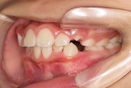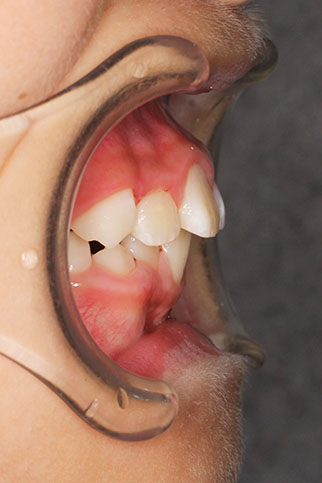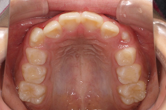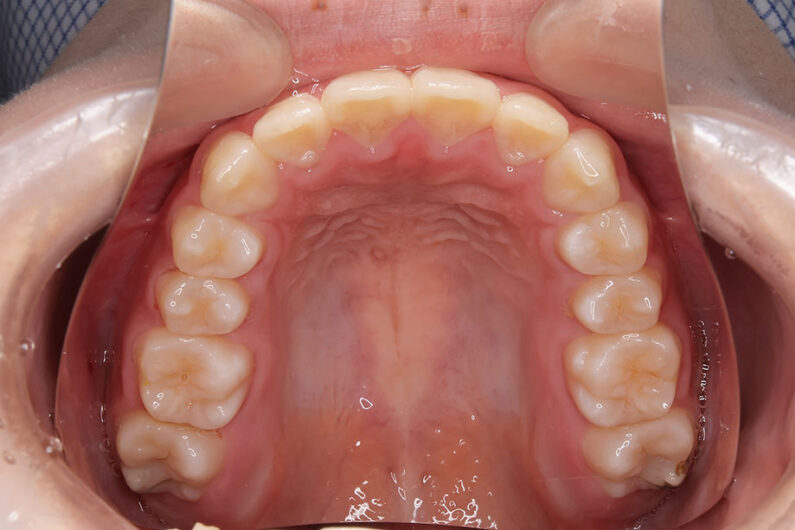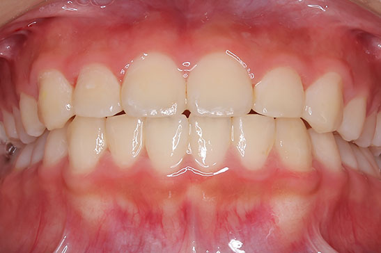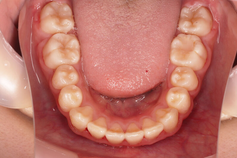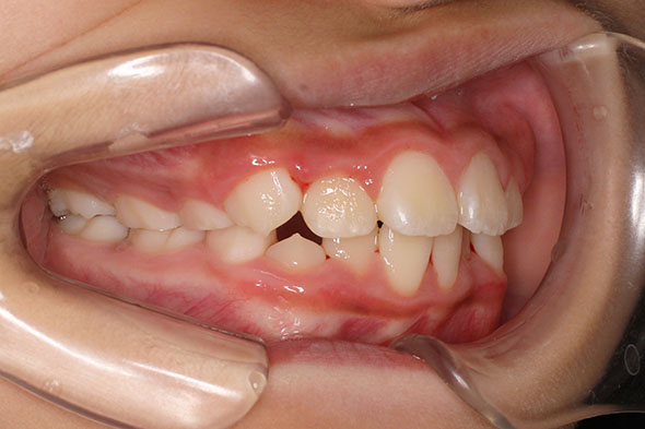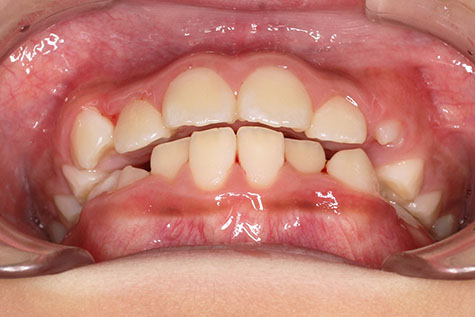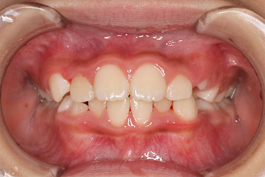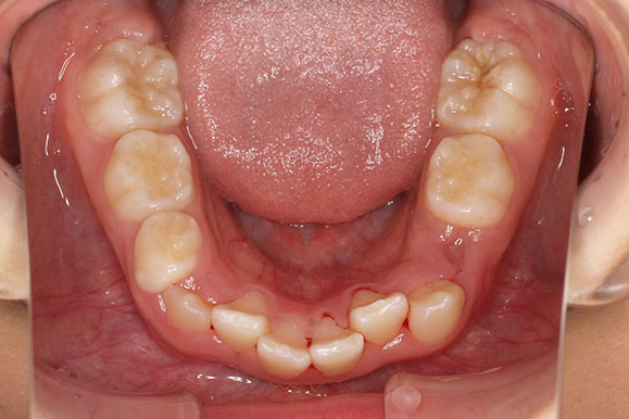 側方歯(犬歯、小臼歯)の生え変わりの時期。 前歯のがたつきを気にされ、小児矯正からの治療を希望されました。 お母様は、矯正治療経験済みですので、治療には前向きで早期治療の必要性を納得されていました。 小児矯正では、永久歯の生え変わるためのスペースを増加させ、がたつきを軽減させることを目的で行います。 残ったがたつきは、全ての永久歯が生え変わってから、本格矯正(マルチブラケット装置での治療)で改善しています。 比較的、叢生量は少ないため、本格矯正は非抜歯にて配列しました。