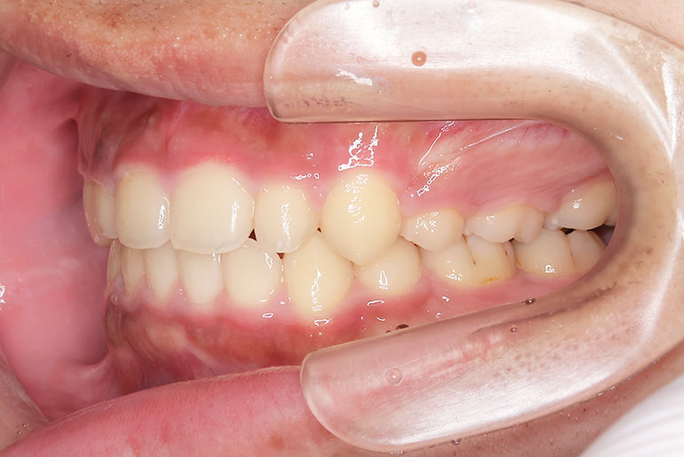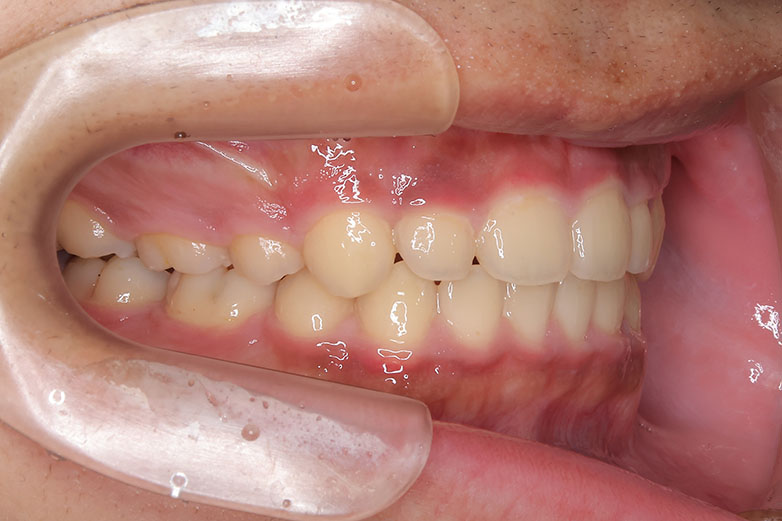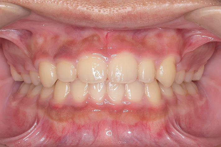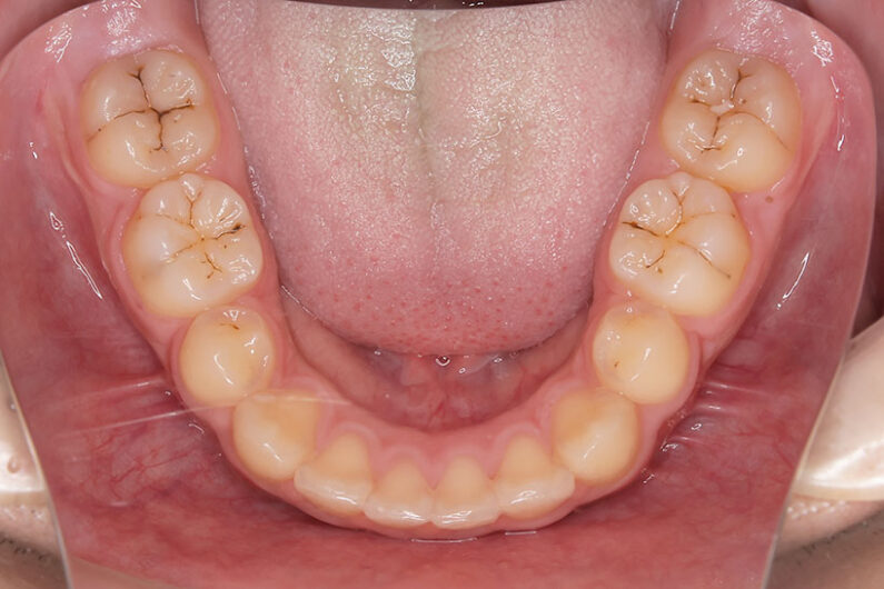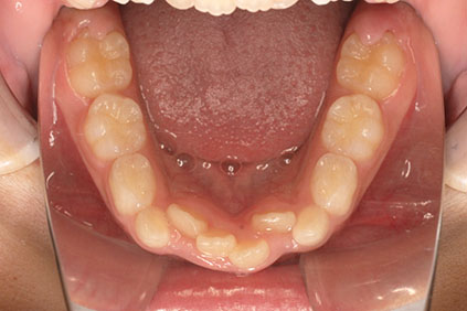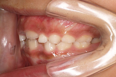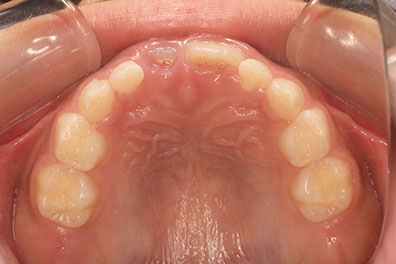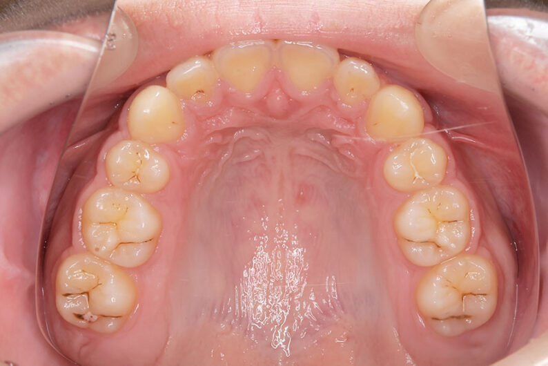 右上の前歯が生えてこない事を気にされ来院されました。 レントゲン写真から、上顎正中に過剰歯が埋伏していることが原因でしたので、抜歯して経過観察。 遅れて、無事に生えてきました。 もし、自然に生えてこない場合は、開窓して、引っぱり出します。(廷出) 状態により、引っぱり出せない場合もあります。 将来的にスペース不足により、上下顎前臼歯部に重度の叢生(がたつき)が予測できますので、がたつきを減らすために、小児矯正で側方拡大を行いました。 小児矯正で側方拡大を行ってもスペースが足りない場合(著しくスペース不足の場合)は、がたつき(叢生、八重歯)が残ります。 残ったがたつき(叢生)は、本格矯正ですべて生え変わった中学生から治せば問題ありません。 来院間隔が平均で1.5カ月でしたので半年ほど治療期間が長いです。