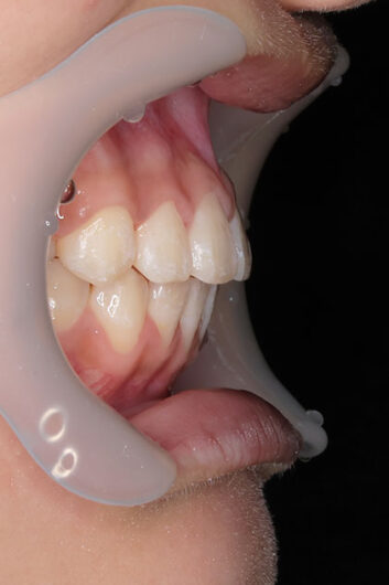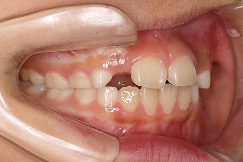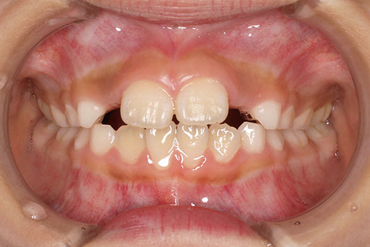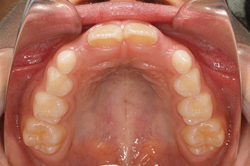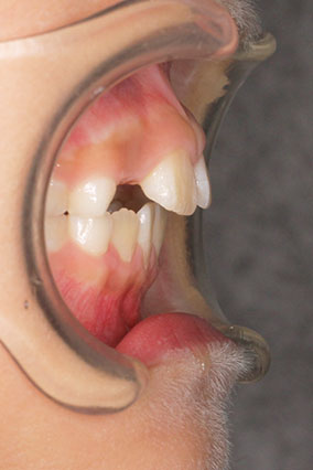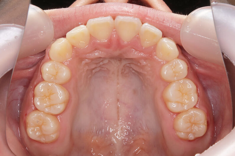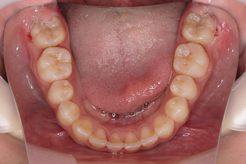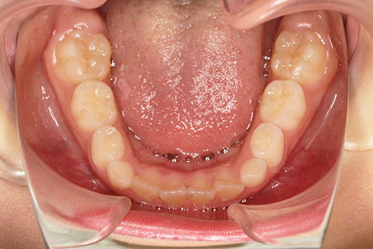 治療が必要なら始めたい、と小児矯正から治療を始めた患者さんです。 検査結果から、3mm程度の上顎前突と、6mm程度の叢生(がたつき)を予測。 小児矯正では、取り外しのできる床装置で治療を行いましたが、装着時間が少なく、あまり効果がありませんでした。 永久歯萌出後(中学1年生ごろ)、再検査 下顎の叢生は少なく、前歯の前後的位置は問題がありませんでした。 上顎は僅かな叢生(がたつき)と、3mmの前突でした。