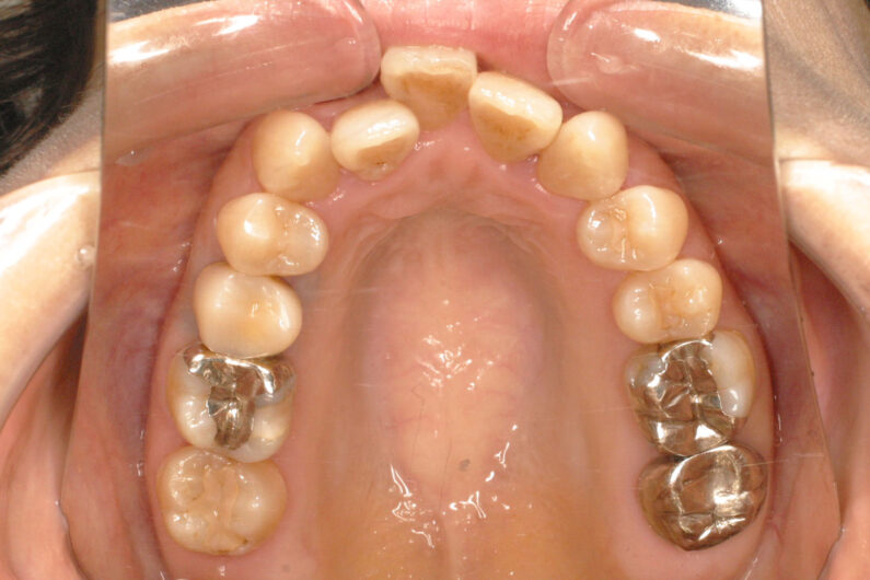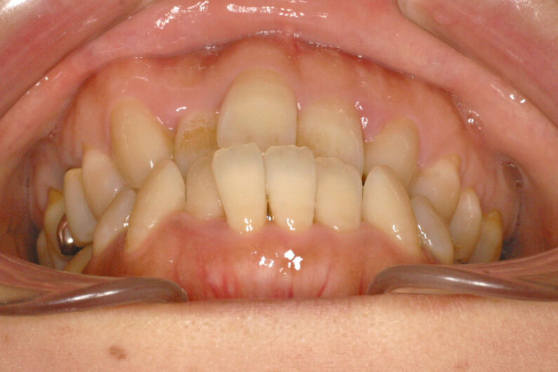 前歯部に叢生(がたつき)がある、受け口、前歯反対咬合の患者さんです。 虫歯の処置歯が多いだけでなく、左上の側切歯が欠如しており、上顎正中(歯並びの中心)が1歯分、左側にずれています。 前歯部の被蓋(咬み合わせ、重なり)と叢生の改善、上顎正中の右側移動を目的として、抜歯による治療を行いました。 マルチブラケット 動的治療期間 2年1か月 調整回数27回