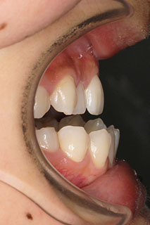 2025.04.23顎変形症下顎前突(受け口)開咬 今月の患者さん2025年04月23日外科手術が必要な下顎前突症(顎変形症)の患者さんです。下顎の正中は左側に大きく偏位しています。骨格性の下顎前突症。前歯部が重度の開口状態です。ガタツキは少なく、上顎前歯の歯軸傾斜をみても大きな唇側傾斜はしていませんので、非抜歯で治療を行いました。動的治療期間(マルチブラケット装置装着期間)は、上下歯列の調整が予想よりも早かったので平均より短く、1年6か月でした。この方は結構早く治療が終了しましたが、顎変形症の患者さんは通常2年半から3年程度の動的治療期間です。横顔、口元のラインもきれいになりました。